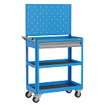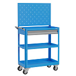 Корпус выполнен из листовой стали толщиной от 0,6 до 1,5мм., покрыт полимерной порошковой краской. С выдвижным ящиком на шариковых телескопических направляющих. Комплект резиновых ковриков. Общая равномерно-распределённая нагрузка на тележку - до 100кг. Верхняя и средняя полка имеют высоту борта 40 мм., нижняя полка имеет высоту борта 60 мм. Размер 950х800х450 мм.