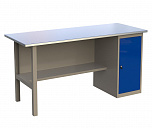 Однотумбовый. Допустимая нагрузка на столешницу 750 кг. Опорные элементы выполнены сварными из холоднокатаной стали. Верстак состоит из  опоры, тумбы P7 с дверью и двумя полками и полки-стенки. Все металлические элементы покрыты полиэфирной порошковой краской. Столешница состоит из фанеры марки ФСФ толщиной 24 мм, которая покрыта лаком-антисептиком и листом оцинкованной холоднокатаной стали толщиной 1,2 мм. Размеры (ВхШхГ) 855x1196x696 мм.