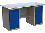 Верстак двухтумбовый поставляется в разобранном виде (4 элемента). Нагрузка на столешницу до 600 кг. Стандартный цвет: корпус - серый глянец RAL 7030, ящики и двери тумб - синий RAL 5017.  Размеры: 855x1400x700 мм. Масса: 78 кг.