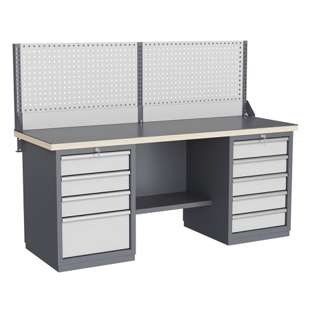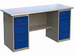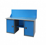 Двухтумбовый. Допустимая нагрузка на столешницу 1000 кг. Опорные элементы выполнены сварными из холоднокатаной стали. Для выполнения сборочных, ремонтных, слесарных, монтажных и других видов работ на производстве, в сервисных центрах, мастерских, гаражах, а также для обучения технологии в учебных заведениях. Комплектуется полкой-стенкой, расположенной под столешницей для удобного размещения габаритного инструмента и оснастки. Размеры верстака: 855x1596x696 мм. Вес: 128 кг. Поставляется в 4 комплектациях на выбор.