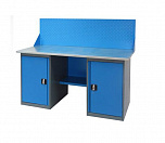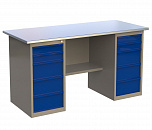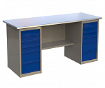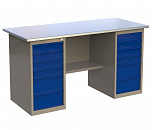 Верстак двухтумбовый поставляется в разобранном виде (4 элемента). Нагрузка на столешницу до 600 кг. Стандартный цвет: корпус - серый глянец RAL 7030, ящики и двери тумб - синий RAL 5017. Размеры:855x1400x700 мм. Масса: 107 кг.
