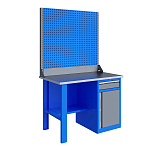 Однотумбовый. Допустимая нагрузка на столешницу 750 кг. Опорные элементы выполнены сварными из холоднокатаной стали. Верстак состоит из столешницы, опоры, тумбы P3 с тремя большими ящиками, полки-стенки и одинарного экрана с кронштейнами. Все металлические элементы покрыты полиэфирной порошковой краской. Столешница состоит из фанеры марки ФСФ толщиной 24 мм, которая покрыта лаком-антисептиком и листом оцинкованной холоднокатаной стали толщиной 1,2 мм. Размеры (ВхШхГ) 1470x1196x696 мм.
