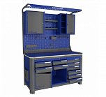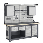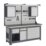 Нагрузка на столешницу 1500 кг. Столешница из листа влагостойкой фанеры марки ФСФ толщиной 40 мм и листом горячекатаной стали толщиной 5 мм. Рама верстака выполнена их холоднокатаной стали. Модуль верстака выполнен сварными. Ящики в модулях устанавливаются на шариковых телескопических направляющих полного выдвижения. Квадратная перфорация для установки крючков, держателей. Размеры: 1982x1993x743 мм.