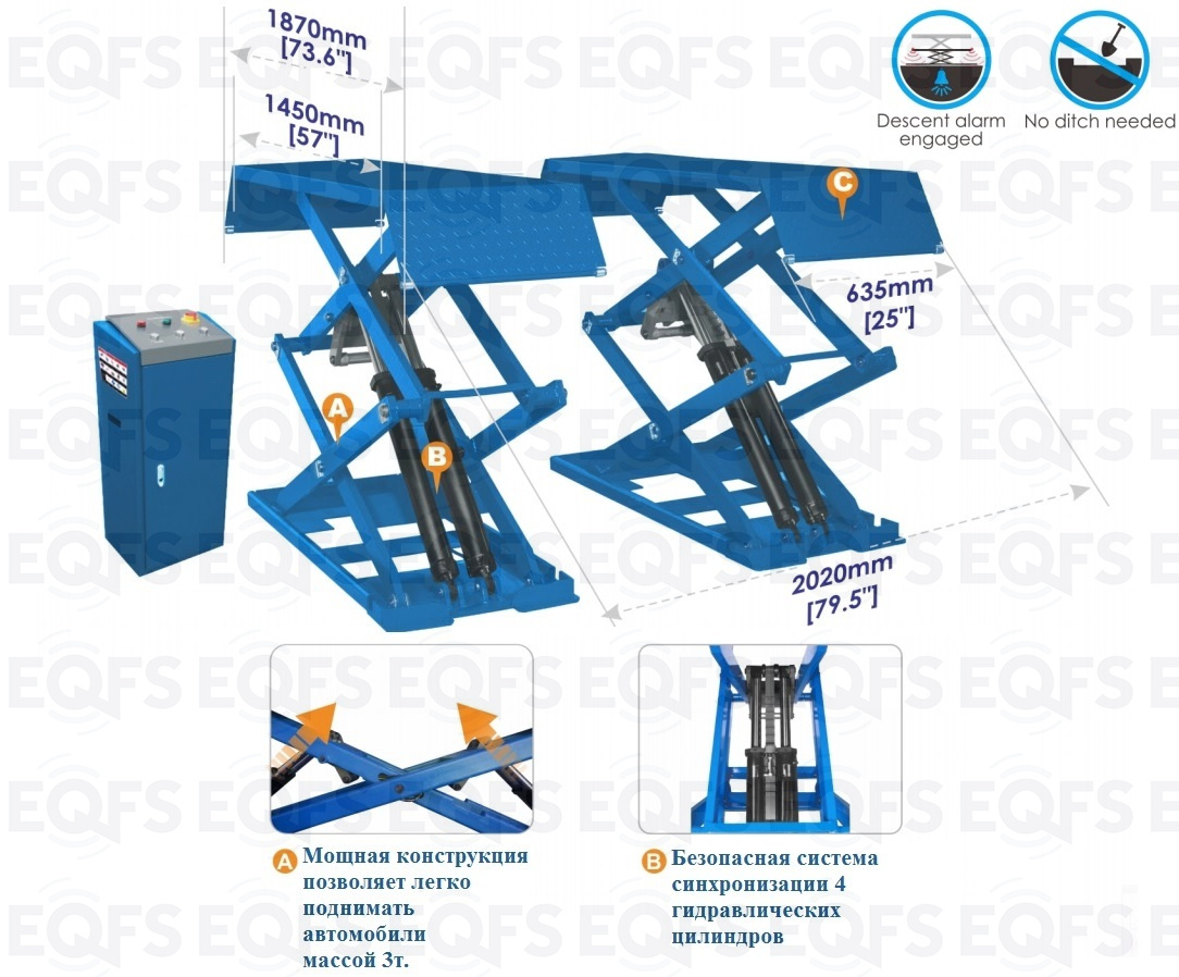 - Безопасная система синхронизации гидравлических цилиндров (автомобиль не упадет с подъемника)