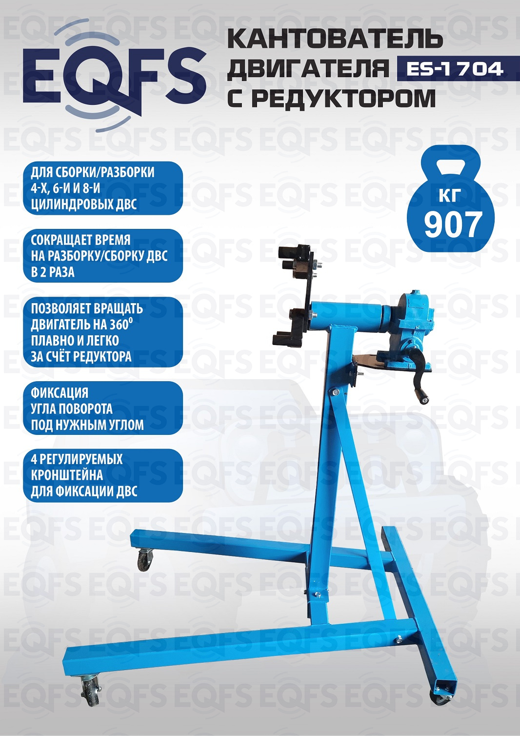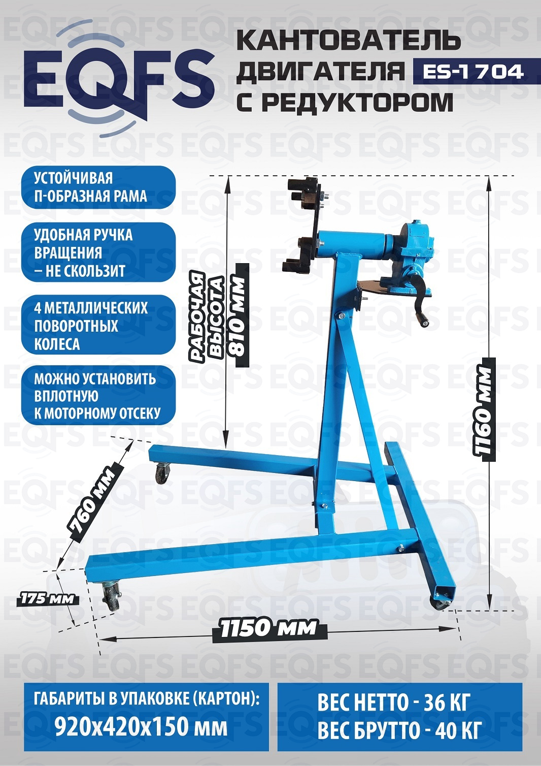 Оснащен редуктором. Для обслуживания двигателей легковых и легких грузовиков. Конструкция оснащена 4-мя регулируемыми кронштейнами для удобства вывешивания и обслуживания двигателей. Специальный механизм вращения позволяет разворачивать обслуживаемый узел под нужным углом, обеспечивая наиболее удобный доступ. П - образная рама с 4-мя поворотными колесами обеспечивают маневренность и устойчивость. Рабочая высота 810 мм. Грузоподъемность: 907 кг.