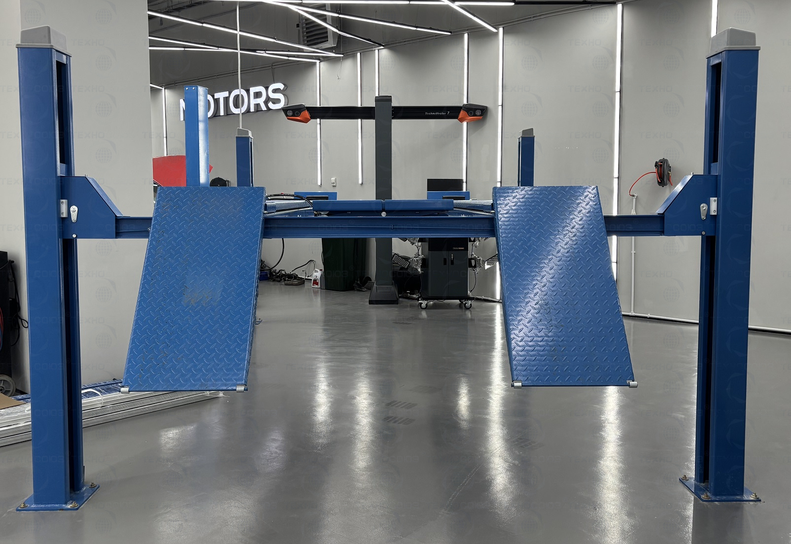 Комплект четырехстоечный подъемник для сход-развала ВСЕХ авто. Длина платформ 4850 мм. г/п.-4,0т. Для сход-развала ВСЕХ АВТО!!! В комплекте: Немецкий насос «Bucher hydraulics». Гарантия 2года + траверса 2т. + анкерные болты 16шт. + противооткатные ограничители 2шт. + противооткатные упоры 2шт. Для любых стендов сход-развал - 3D, лазерных, инфракрасных, кордовых. ВАЖНО!!! ДЛИННЫЕ ТРАПЫ -4800мм. — это позволяет прокатывать авто на подъёмнике. Многие стенды развала требуют прокатки!!! Подъём 1800мм, Между колоннами 2910мм. Усиленный — 1280кг металла.