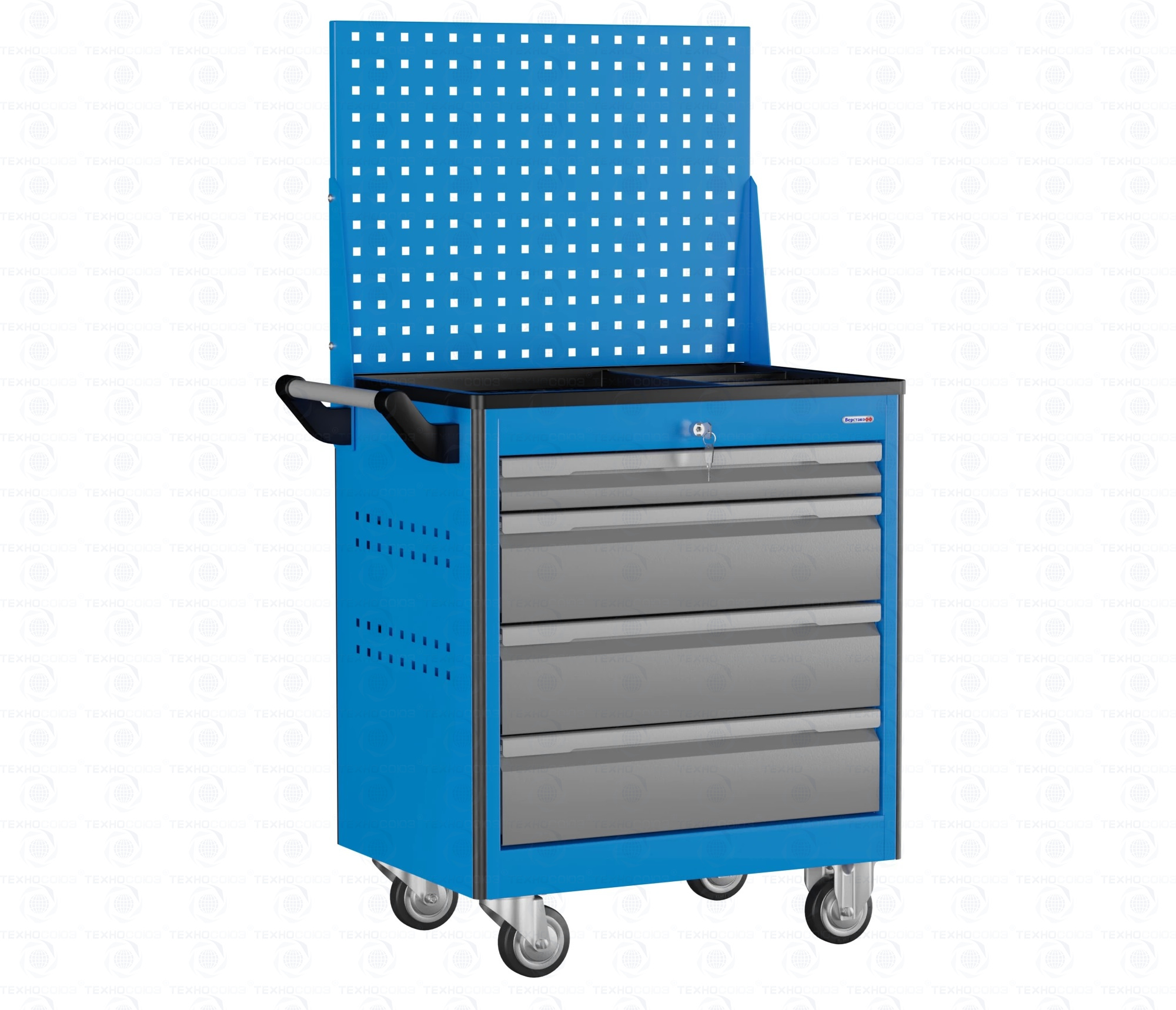 Все металлические элементы тележки покрыты полиэфирной порошковой краской, обеспечивающей хорошую износостойкость покрытия и стойкость его к моющим средствам и смазочным веществам. Цвет и текстура покрытия корпуса тележки RAL 5015, полуматовое. Цвет и текстура покрытия ящиков тележки RAL 7037, глянцевое. Цвет и текстура покрытия накладок на ящики RAL 9006, глянцевое. На крыше тележки установлен формованный лоток, выполненный из АБС-пластика толщиной 2 мм. В лотке имеется одно большое основное отделение и три малых отделения для хранения метизов и небольшого инструмента. Тележка снабжена центральным замком с поворотом ригеля 180 градусов, который закрывает одновременно все ящики. Замок неподвижно и прочно закреплен на корпусе тележки. В комплекте имеется два ключа. Тяга замка подпружинена.