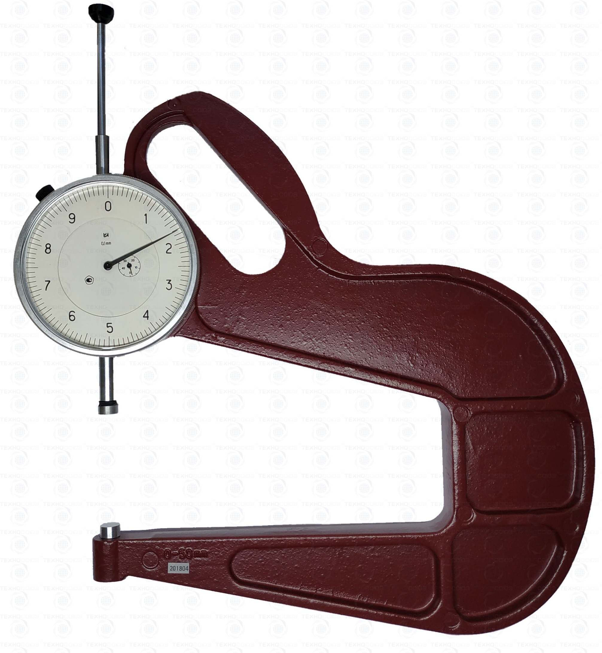 Толщиномер представляет собой скобу, в которой сверху расположено отсчетное устройство с измерительным наконечником , а снизу запрессована пятка. У толщиномера без нормированного измерительного усилия измерительный стержень возвращается в исходное положение возвратной пружиной.