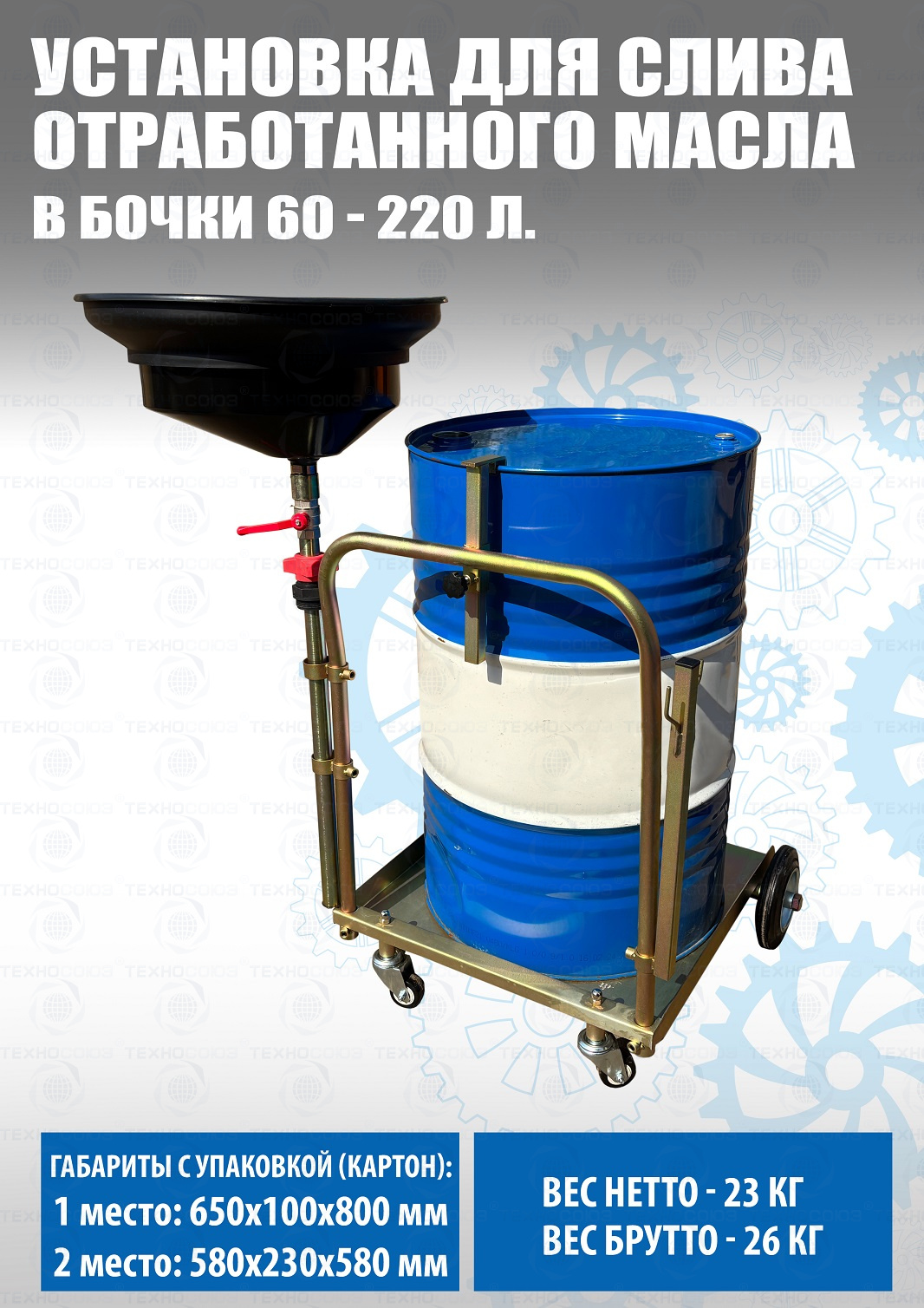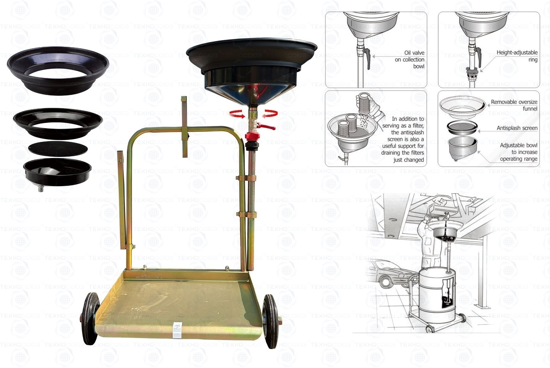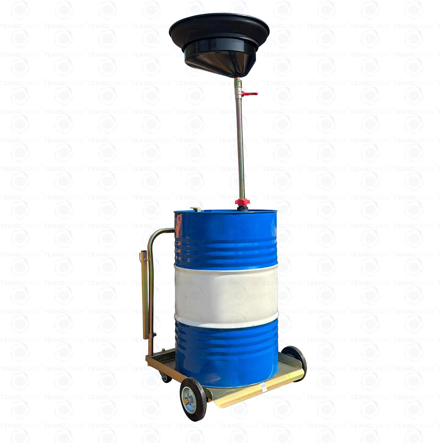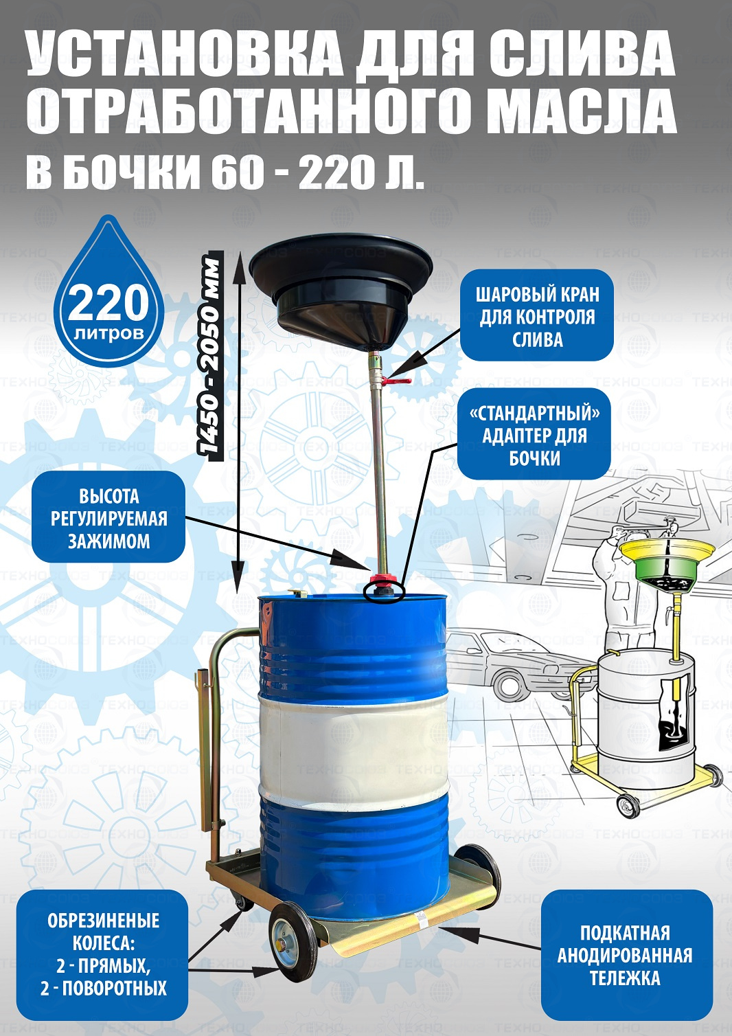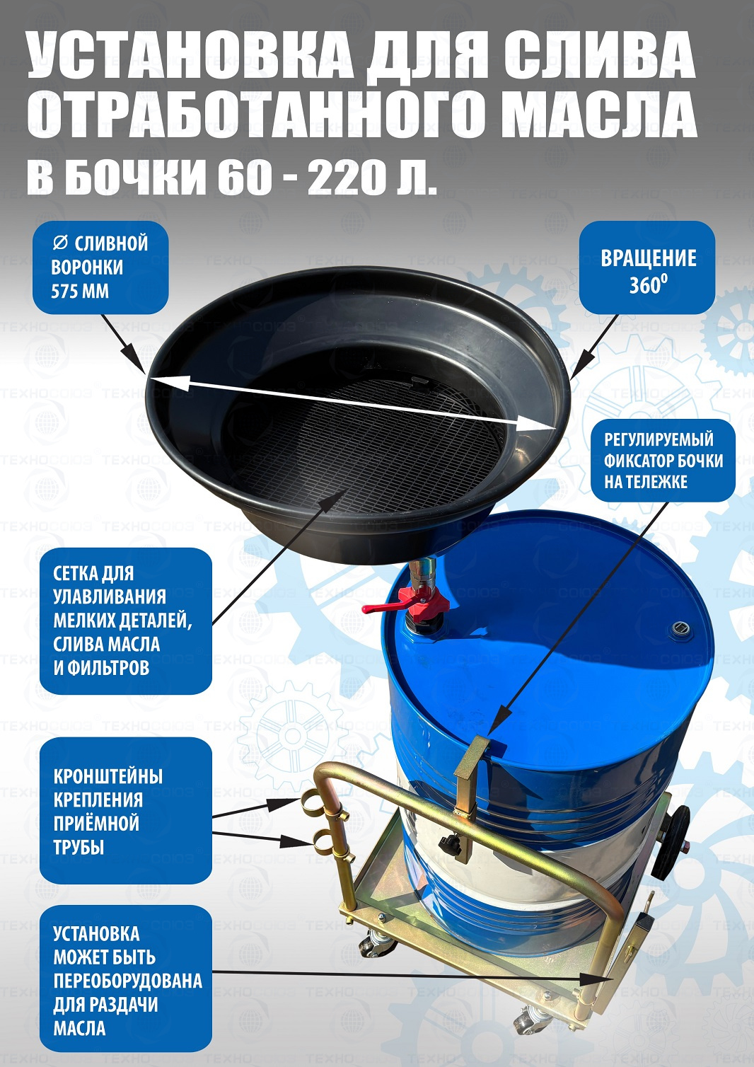 Установка для слива/сбора «отработки», антифриза в бочки 60÷220л. на подкатной анодированной тележке. Для любых транспортных средств, вывешенных на подъёмнике. Высота регулируется зажимом 1450÷2050мм. Фиксатор бочки на тележке. Сетка для улавливания мелких деталей, фильтров и предотвращения разбрызгивания. Поворотная воронка 360⁰ со смещённым сливным отверстием. Шаровой кран для контроля слива. Обрезиненные колёса большого диаметра для не ровных полов. Контроль заполняемости бочки через отверстие для воздуха.